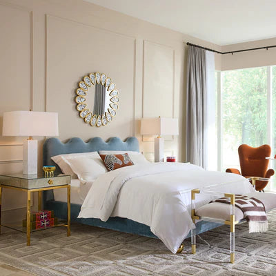 We collaborated with an artisanal workshop in India where a master beader imbued our clean graphic designs with craftsmanship and soul. Each artwork is hand-beaded on linen ground and takes nearly 100 hours to create. Beads of varying heights and patterns within patterns create a sense of depth and dimension. The result is part pop art, part textile triumph.