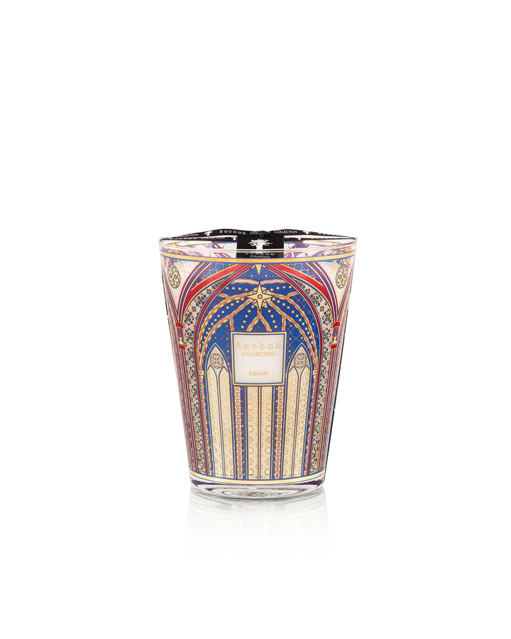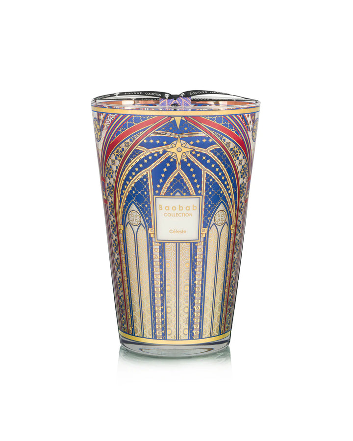 The Céleste scented candle is decorated with a 24-carat gold and deep blue silk-screen print, recalling the architecture of the Krakow Cathedral’s celestial vault. The design is an interpretation of the nave: an ogival ceiling, painted on a blue background and studded with small golden stars. The decor is placed around the glass like imaginary doors opening to the sky.