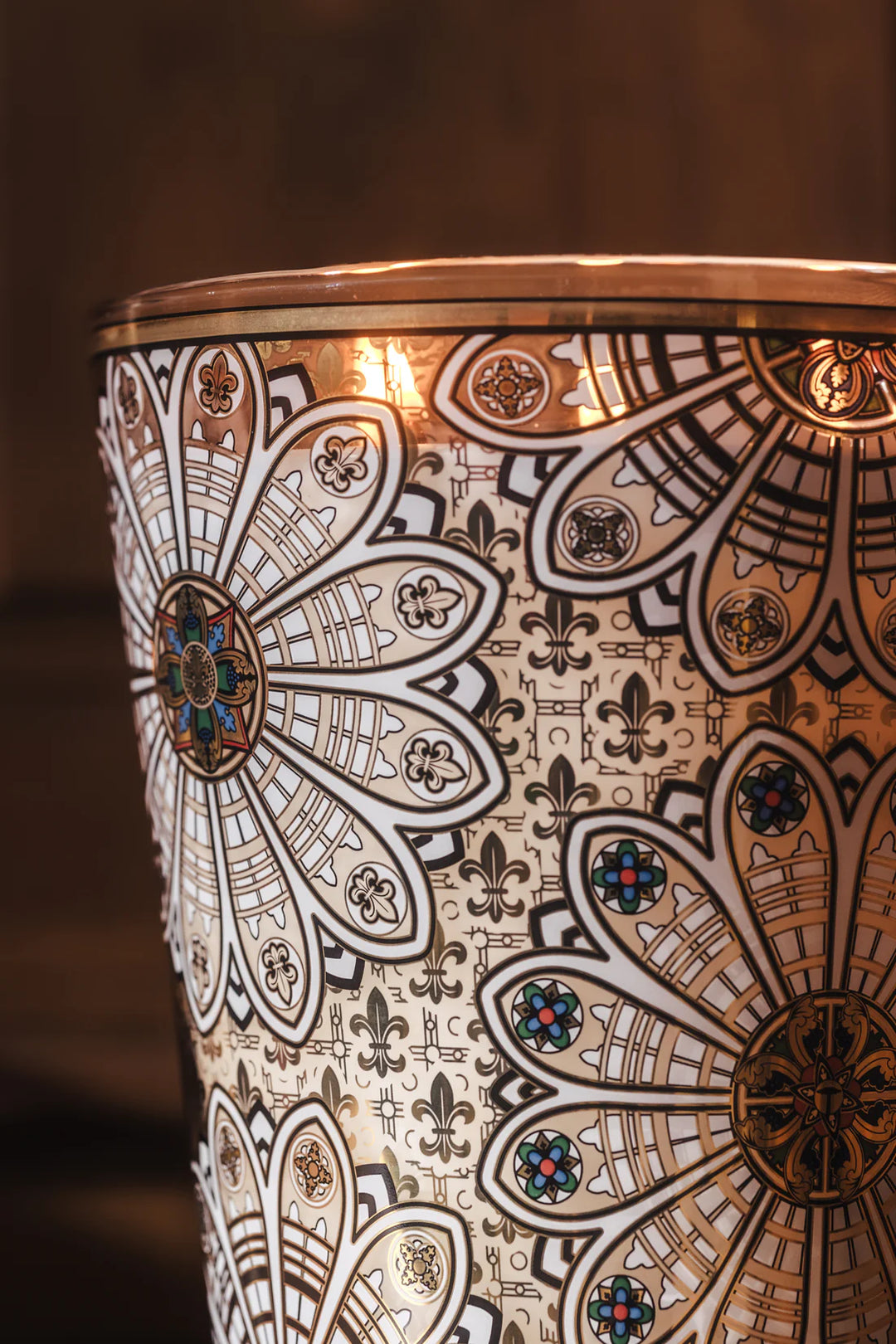 The Rosace candle pays tribute to Gothic architecture and the spiritual light of cathedrals. Its glass is covered with a precious silk-screen print, where gold and subtle colors draw motifs inspired by medieval rose windows. Like luminous lace, this refined décor is set against a background of fleur-de-lis, an emblem of nobility and purity.