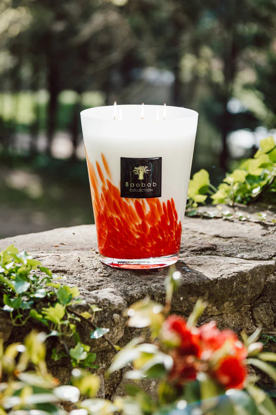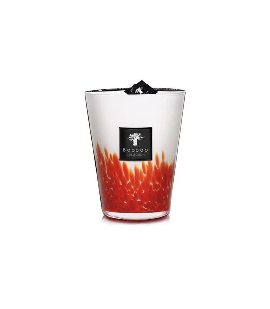 The Feathers Maasai scented candle is made in an opaline hand-blown glass with touches of red. Its mysterious fragrance will take you to the heart of the Maasai lands where men in red draperies roam the searing savannah.