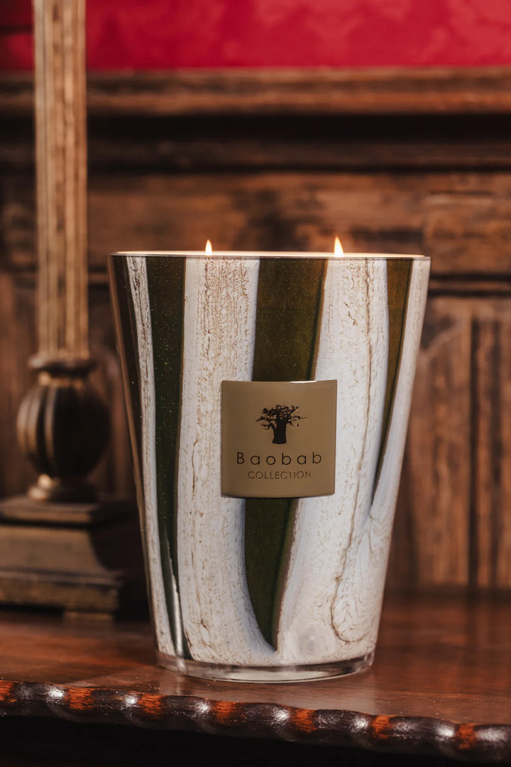 The glass of the Sherwood scented candle is punctuated with vertical lines resembling majestic trunks reaching for the sky. Deep green, with khaki highlights that sometimes fade into browns or yellows, the candle comes alive with bewitching reflections.