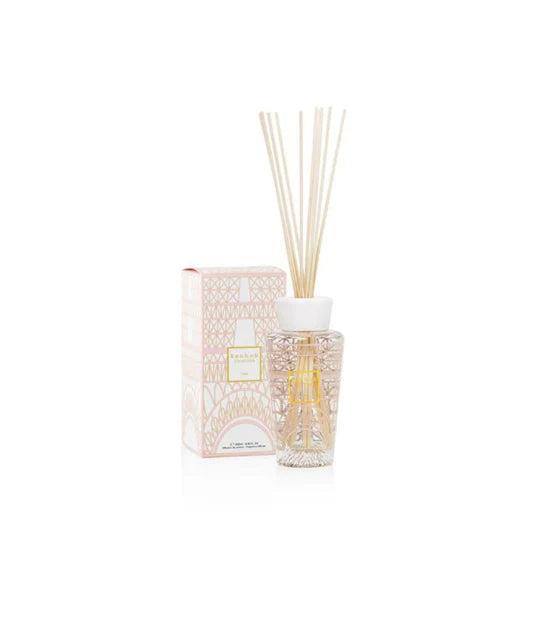 The Paris home fragrance diffuser is decorated with a powder pink and gold silk-screen print depicting the base of the Eiffel Tower's stylized structure. We are celebrating the lovely month of May in Paris, memories of chestnut trees and lime trees in bloom.