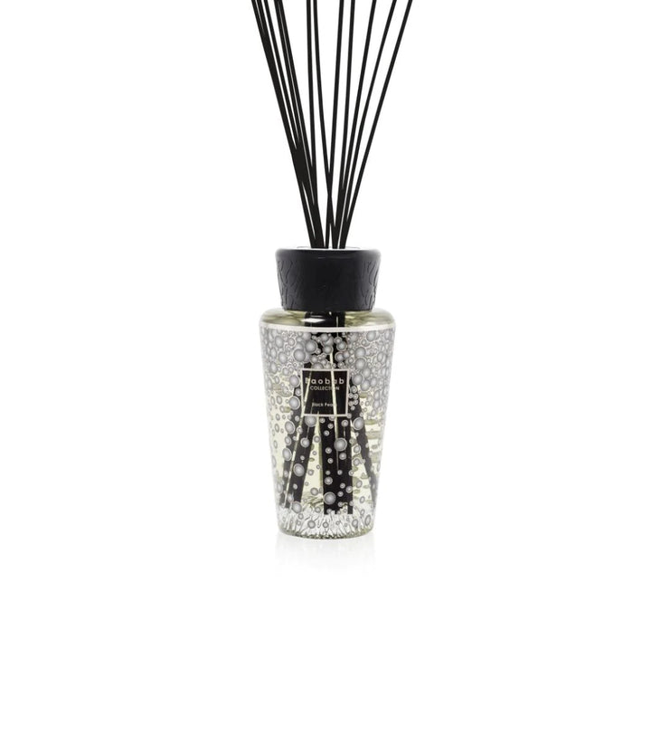 The Black Pearls home fragrance diffuser is covered in a silkscreen pattern of black pearls and platinum. Through the glass you can see an engraved dome with a root pattern that matches the black bakelite cap.