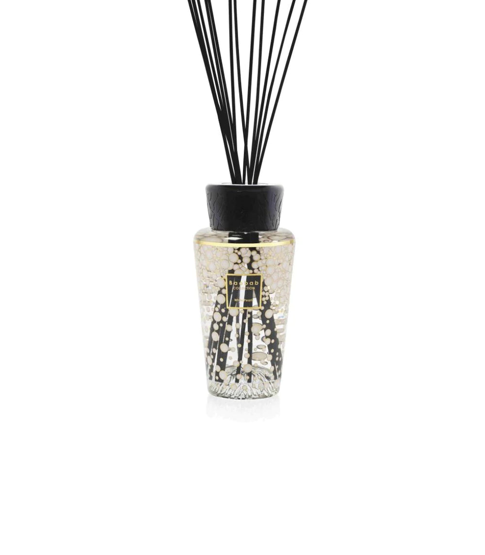 The White Pearls home fragrance diffuser is a bottle covered in a 9-karat gold silkscreen print with a white pearl pattern. A black bakelite cap engraved with roots brings an elegant finish to the object