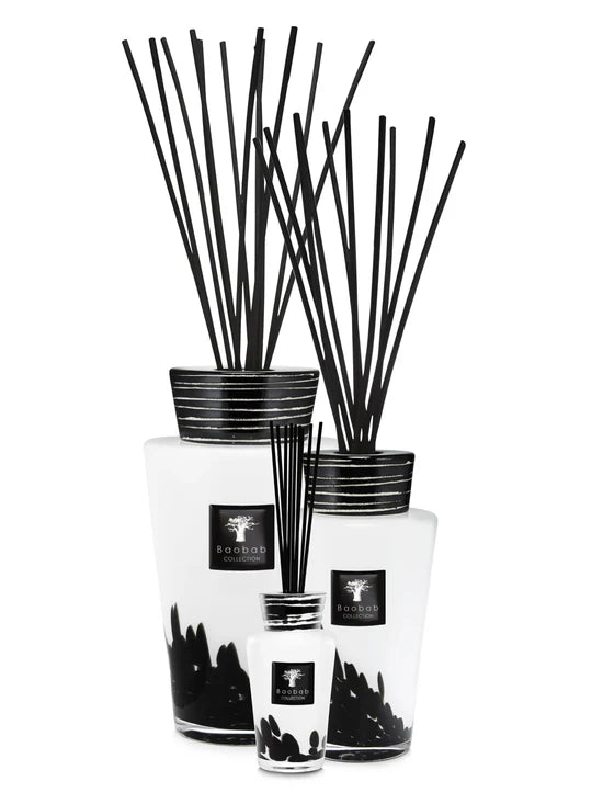 The Totem Feathers fragrance diffuser’s bottle showcases the mastery of our glass artisans, who arbitrarily inserted black confetti details into the hand-blown opaque white glass so as to create a feather effect.