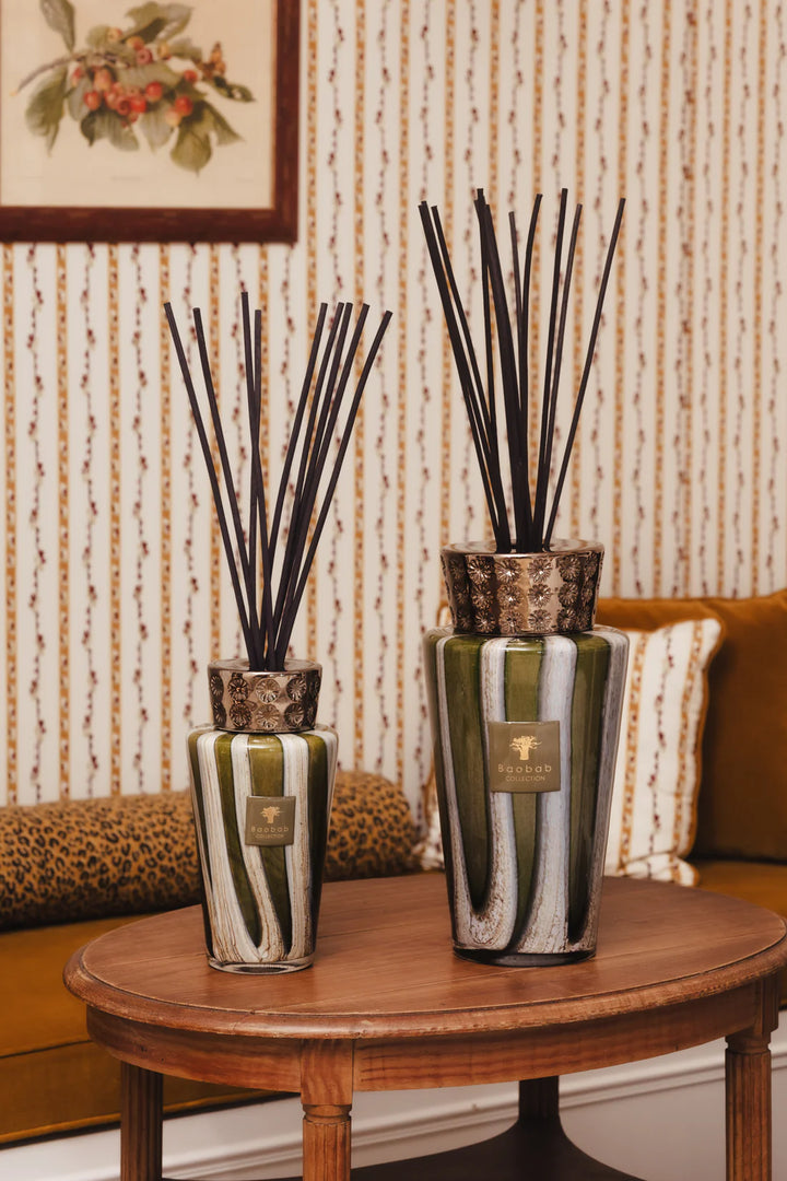 The Sherwood Totem fragrance diffusers are punctuated with vertical lines resembling majestic trunks reaching for the sky. The glass of the diffusers, in shades of green, establishes itself in interiors as a unique and majestic decorative object. The woody fragrance of Sherwood Totem diffusers is wonderfully at home in sophisticated, elegant settings.