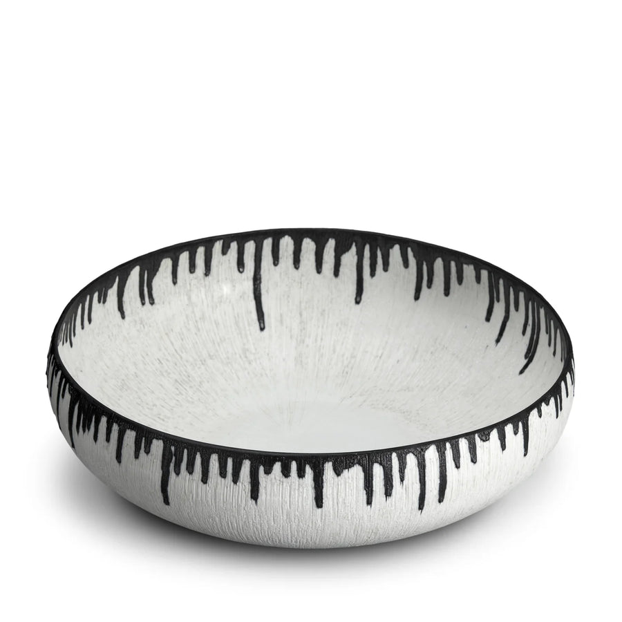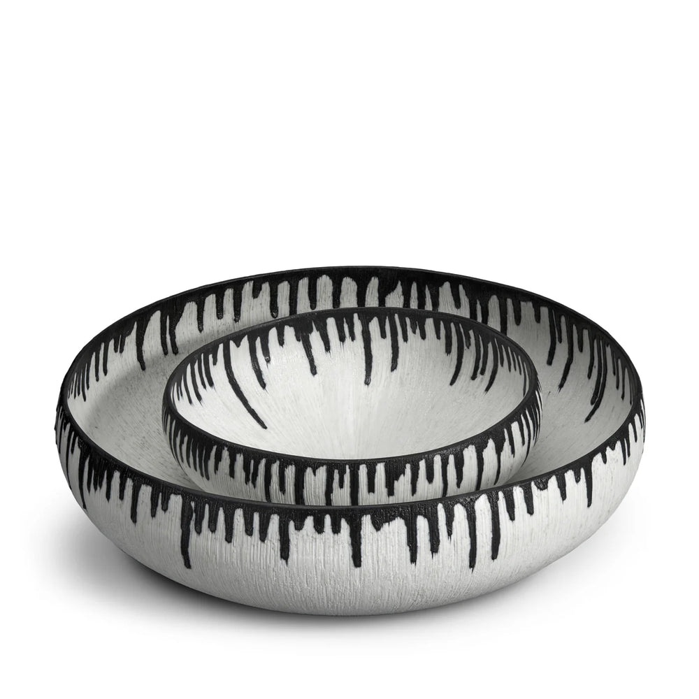 A handmade collection of vessels inspired by the Japanese technique of indigo dyeing. Each hand-crafted piece is raked with grooves that allow the inky drops to flow. The unique pattern on the porcelain makes each piece one of a kind. Suitable for food service or as a decorative accent.