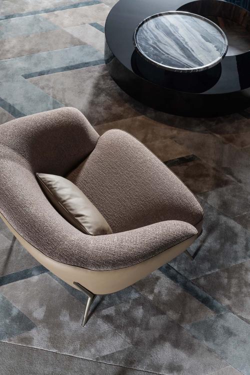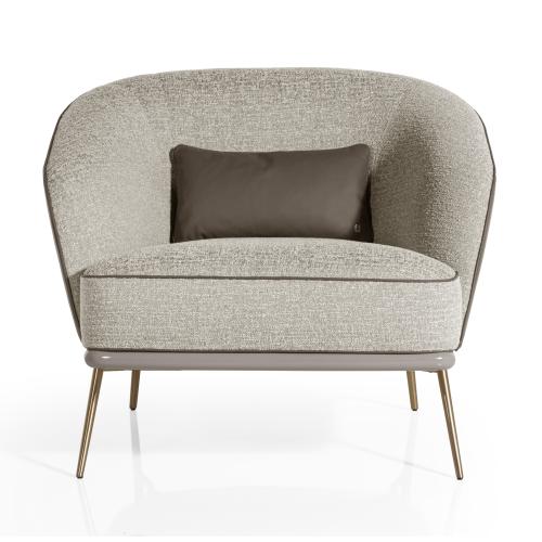 Armchair in leather or fabric with bi-colour upholstered structure. Struc-ture and backrest in plywood and solid wood with seat frame webbed with eleastic belts and curved armrest and backrest structure. Padding of external structure and cushion in polyurethane with different densities, seat frame in wood finished with glossy polyester coating (RAL/NCS colours). Feet and lower frame in conic stainless steel available with satin metal lacquered finish. Seat and back piping in contrasting leather. Small back cushions with contrasting upholstery.