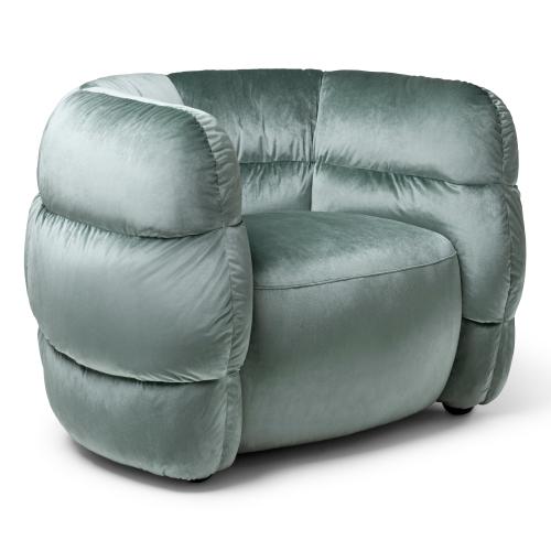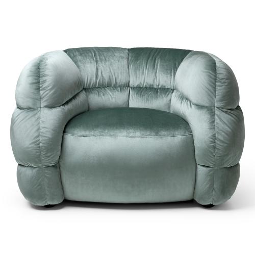 Upholstered armchair in leather or fabric, plywood and fir solid wood. Seat with elastic straps springing and seat cushions in open-cell polyurethane foam with a density of 35 kg/m3 and Memory foam, covered by a quilted goose down padding. Armrests and backrest upholstered with differentiated density polyurethane and padding with single chambers filled with micromax technical fiber, forming a soft cover with a "down effect", both inside and outside.