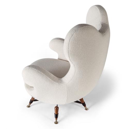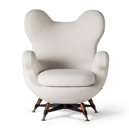 Upholstered armchair in elastic fabric. Main structure made of solid wood and plywood. Seat suspension with elastic straps. Upholstered with differentiated density polyurethane and acrylic wadding. Base composed of a five-star steel base in black and solid wood feet equipped with brass feet, available in the metallic finishes selection.