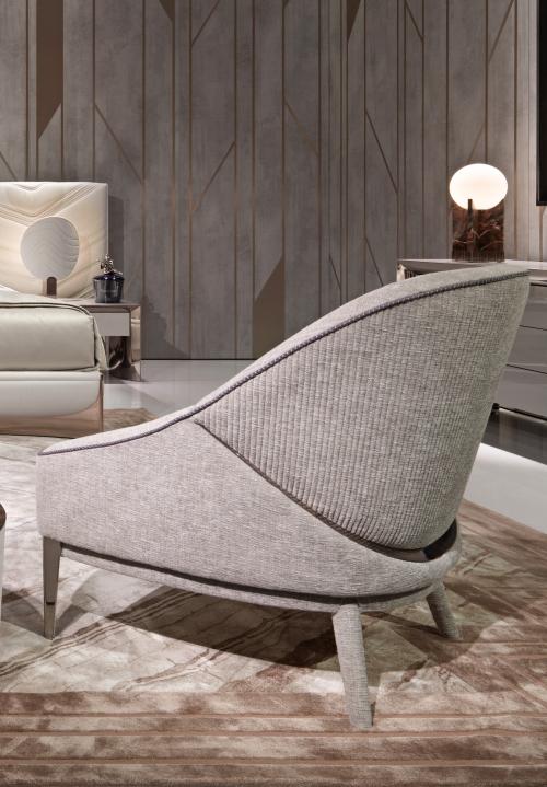 Seat and backrest structure in curved plywood, elastic straps springing system; base structure in poplar plywood and beech solid wood, upholstery in leather or fabric. Internal padding in polyurethane with different densities and Memory Foam®, embedded within a feather-proof lining, filled with down. External upholstery quilted with cannetté motive. Decorative friezes and front feet in satinized stainless steel. Metal parts availa-ble in the satinized metal finishing selection. Available in the ROSEMARY RADICA version with the upper back in burr walnut with a 100 gloss finish.