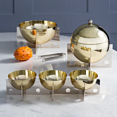 Gleaming sheets of steel with signature circle cutouts are pieced together to create a bisected base for perfect half-spheres. Architectural and atomic, our Berlin Ice Bucket adds bold glamour to your bar cart. Debonair enough for a dude's dinner party, but just as divine for ladies who lunch.