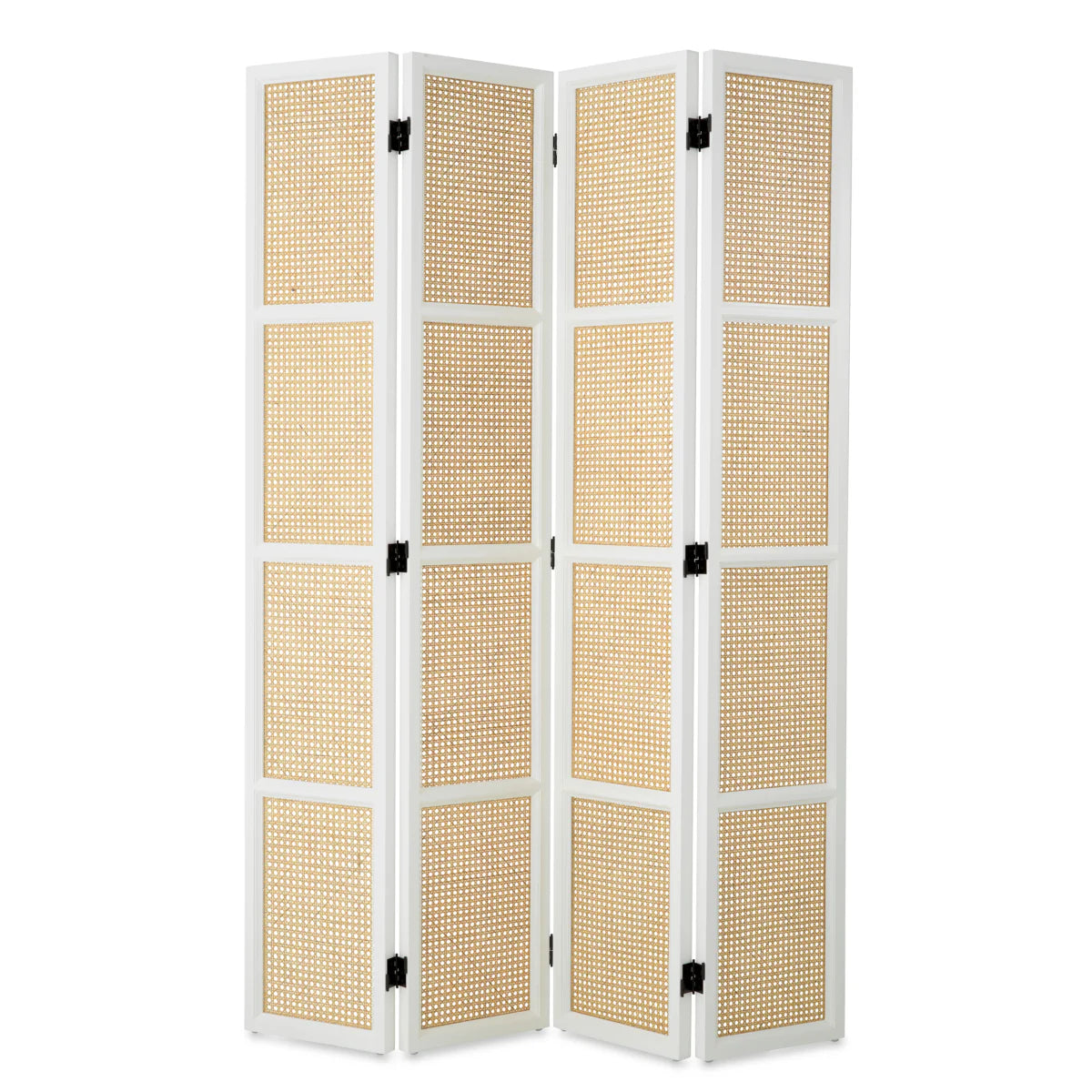 Elevate your sanctuary with the Folding Screen Bahamas in a pristine piano white finish, enhanced by natural cane accents and crystal-clear glass panels. A harmonious blend of classic elegance and modern design, this luxurious piece offers a serene aesthetic, perfect for discerning tastes seeking refined sophistication and timeless beauty. Transform your space into an oasis of style.