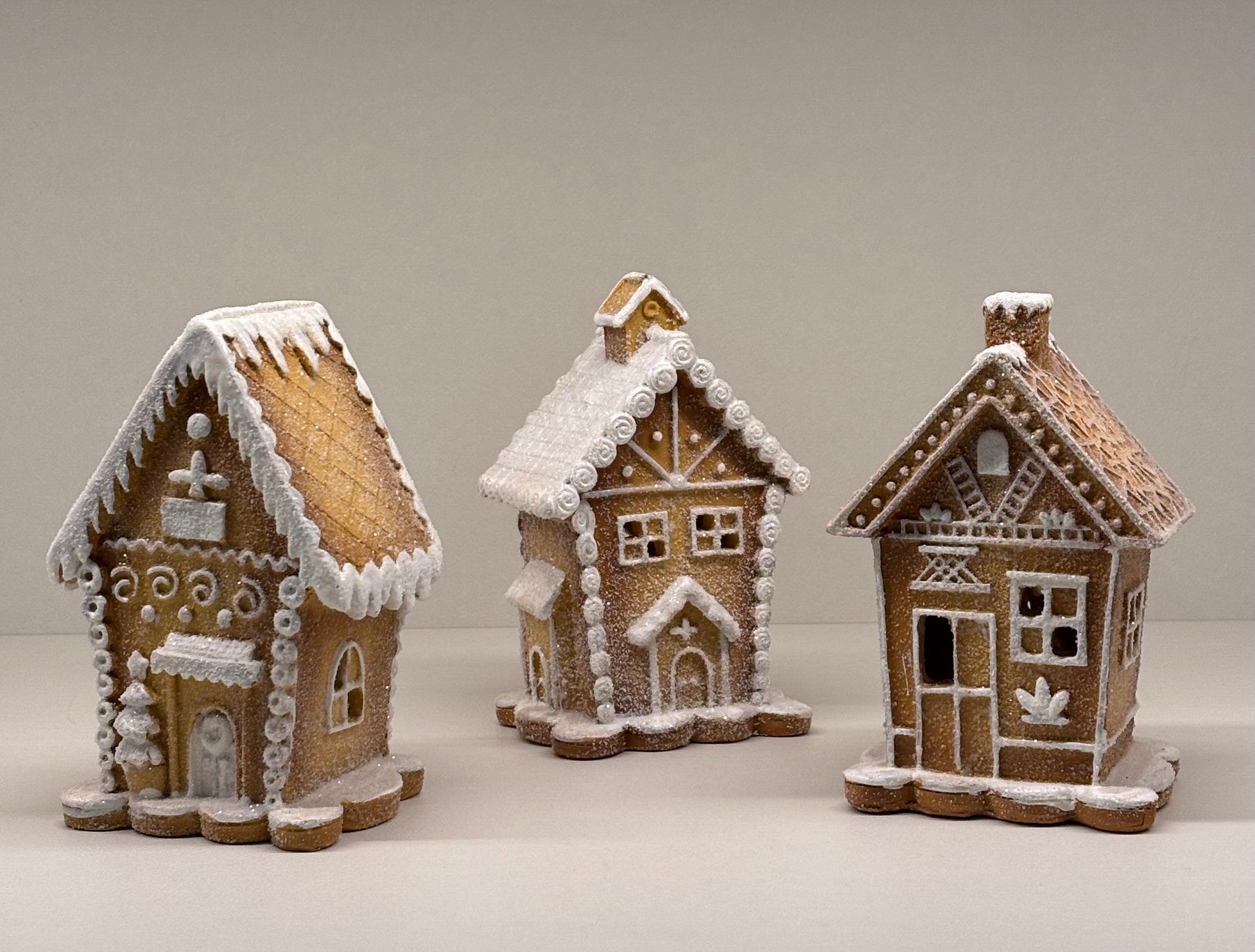A charming set of 3 gingerbread-style houses decorated with frosted icing, perfect for festive holiday décor.
