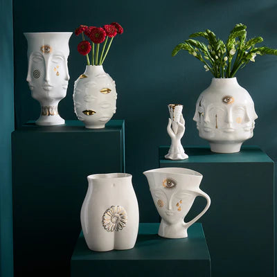 Jonathan sculpts and throws the models for our Muse pottery and then substitutes our signature geometric relief patterns with body parts—faces, breasts, lips—to create a surreal style. Pieces are inspired by our favorite artists' muses.