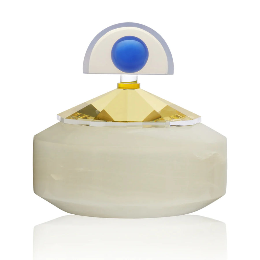The Blueberry Bonbonniere is created in delicate white onyx and crystal in colours of yellow and blue. The white onyx is a precious natural stone, often used to create special and luxurious items, in this case the Blueberry Bonbonniere. This bonbonniere makes a perfect place to store small things for yourself or someone special.