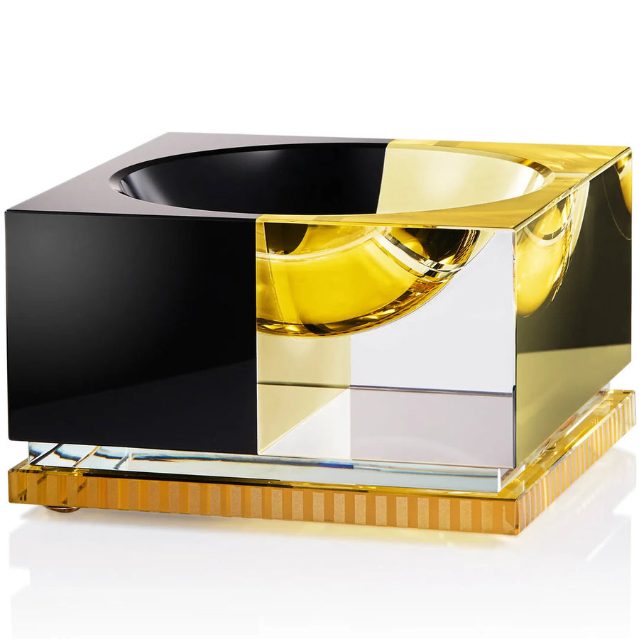 Reflections Copenhagen's Denver bowl draws inspiration from the rock 'n' roll and punk era.  It is an example of the designer’s fascination with light and reflection and can be seen when the coloured crystals are illuminated.  It is crafted from fine hand cut crystal and is shaped into a thick cube which is interrupted by a dipped, round centre. Place it on a coffee table for a Rock n Roll -inspired focal point.