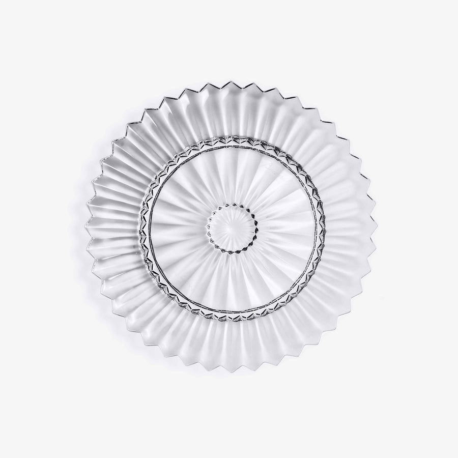 The Mille Nuits dessert plate features artfully crimped edges, like a hand-sculpted pate brisée, or piecrust. The grooved circumference is a stunning framework that epitomizes Baccarat’s fine craftsmanship. Moreover, the detailing etched into the underside of each plate yields a stunning optical effect. As the lines irradiate from the center, they highlight the prismatic possibilities of the Baccarat crystal. The dessert plate is part of a three-piece set that also includes a side plate and dinner plate (each produced in standard European dimensions). Perfect for entertaining, the dessert plates are a flawless way to finish a meal. Mille Nuits is a reference to the 1001 Tales of The Arabian Nights. Designed by Mathias for Baccarat, the collection also extends to stemware and lighting.