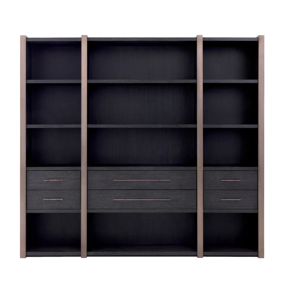 The charcoal grey oak veneer of the case goes well with the medium bronze finish of the frame and handles. Practical and stylish, this contemporary wall unit offers plenty of storage space with a visible part for showing off your trinkets, 2 large drawers in the middle and 2 smaller drawers on either side.
