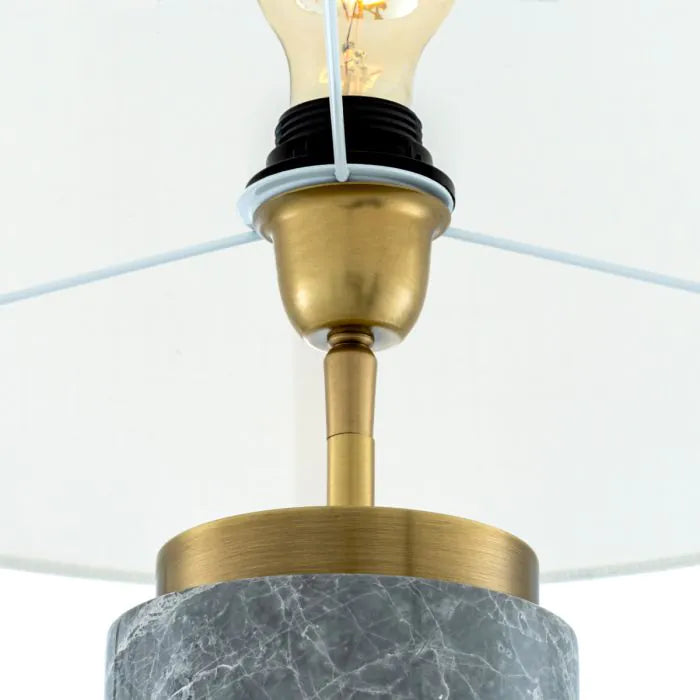 This lovely lamp has a cylindrical body of grey marble and a base and socket with antique brass finish. It is completed with an off-white drum shade to suit all décors. Ideal for hallways, living rooms, dining areas, bedrooms and more.