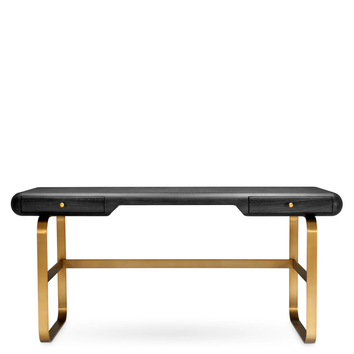 Elevate your workspace with the Desk Nathaniel, featuring a striking charcoal grey oak veneer and sleek brushed brass finish. Its gracefully rounded silhouette and dual drawers blend sophistication with utility, making it an ideal choice for those who appreciate luxury design. This piece resonates with timeless elegance and contemporary allure.