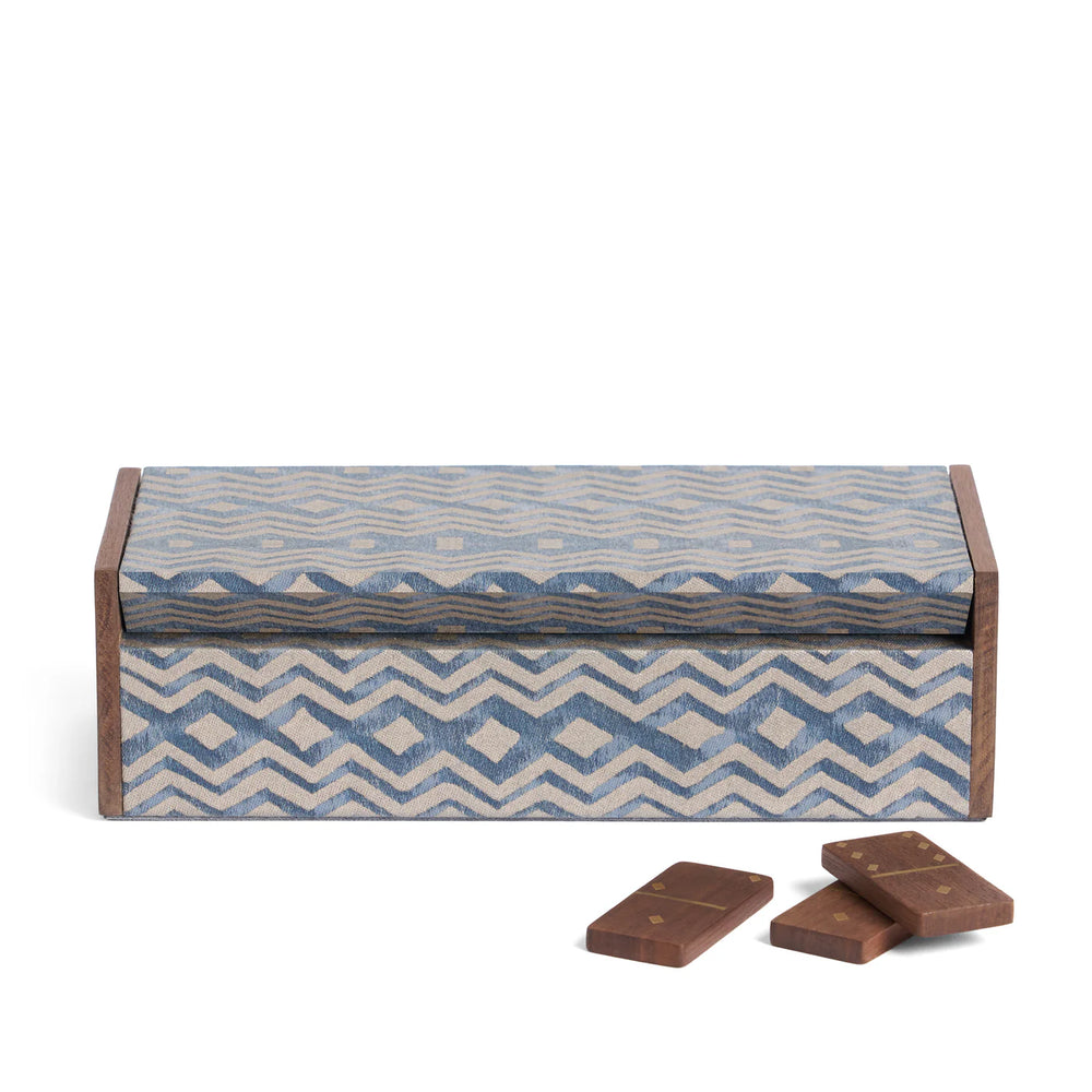 A study in refined play, this domino set is handcrafted in walnut with brass detailing and diamond-shaped dots. The box, lined in suede and wrapped in Fortuny fabric, is as much a treasure chest as it is a game case.