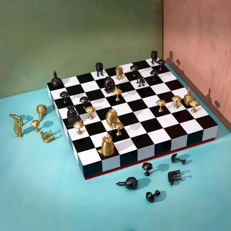 Inspired by rediscovering the joy of being with family and friends, L’OBJET Haas Brothers games facilitate revelry that goes late into the night. Chessboard inlaid with black and white stone, with individually sculpted brass pieces.