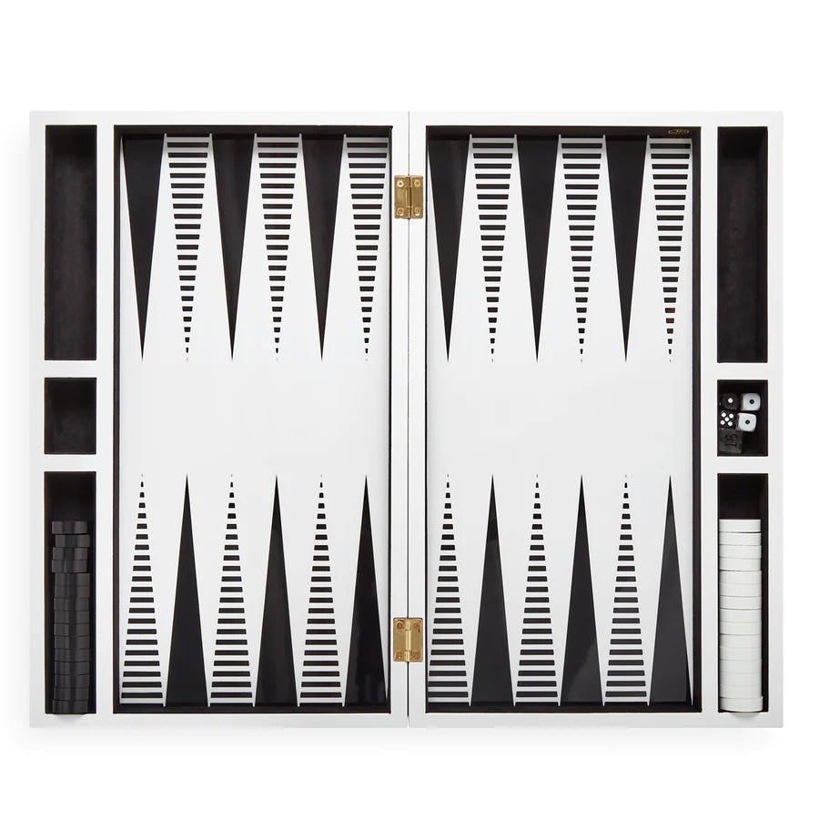 Our Op Art Backgammon Set elevates your evening entertainment. Glam and glossy, high-contrast lacquer turns this preppy pastime into Pop Art. Black and white never goes out of style, and you'll never want this game out of your sight. Leave it open to reveal its mind-bendingly modernist board, or close it for a chic cocktail table accent. The perfect gift for a bold bon vivant.