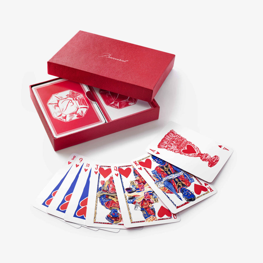 Designed by Alexandre Benjamin Navet, the first deck of Baccarat cards takes the player into a joyous imaginary world with vibrantly colored prints. With bold strokes, the multi-skilled artist and designer has drawn a series of tableaux stand side by side to the Maison's iconic products in a dialogue that embraces both heritage and modernity. Playing with the codes, creating emotion, having fun: this crafty master of contemporary drawing has drawn himself into one of the characters. Can you find him? Sold in a gift-box of 2 decks of 55 cards, Made in France by Grimaud Maître Cartier.