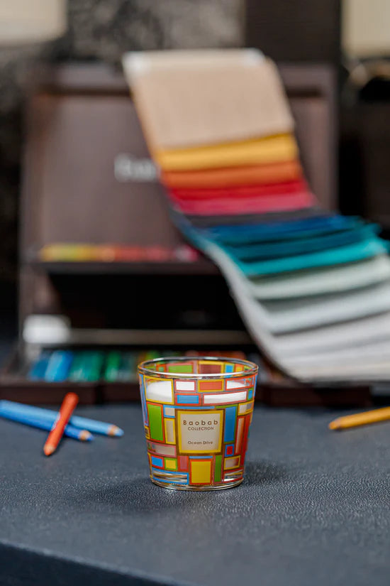 The Ocean Drive scented candle is decorated with a screen-printed graphic pattern inspired by artist Peter Halley’s work. The candle's design is an abstract interpretation of the neon colors of Ocean Drive's windows.