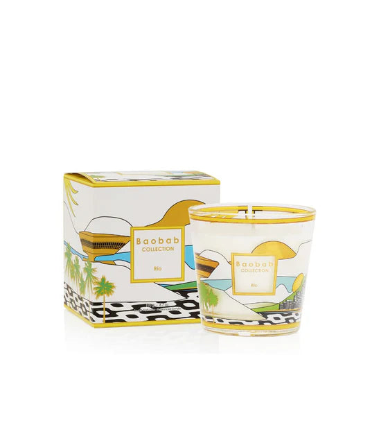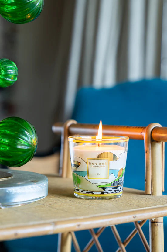 The Rio scented candle is covered with a gold and color silkscreen print that reflects this metropolis’ mythical architecture. One recognizes the museum of contemporary art of Miteroi drawn by the architect Oscar Niemeyer, the cobblestones bordering the beach of Ipanema, and a soft horizon with a glimpse of Sugarloaf Mountain. Its fragrance of bergamot, green tea and musk will take you to the warmth of this tropical city.