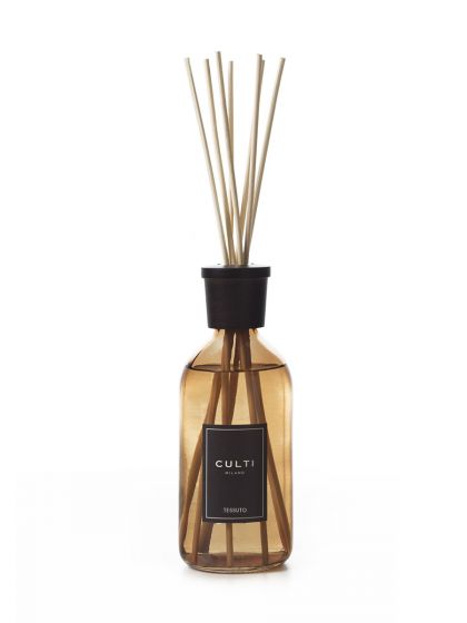 Clear coloured glass bottles with coloured labels and Brown maple wood cap. The CULTI COLOURS line is a delightful burst of energy that livens up every room. Tessuto: Walking through a cotton field, hands open, caressing the fluffy bolls. Touching the lightness of fine silk weaves and natural linens on Lake Como; closing your eyes and breathing in their cool, reassuring texture. Feeling at home, always.