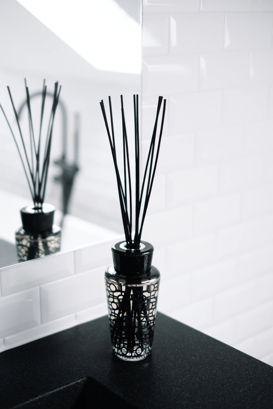 The Gentlemen home fragrance diffuser is covered with platinum and navy blue silkscreen print, with colors borrowed from the male wardrobe. The bottle is topped with a black bakelite cap engraved with a root motif. A dome at the bottom of the bottle bears the same motif, visible through the glass’ transparency as it adds a sophisticated touch to the object.