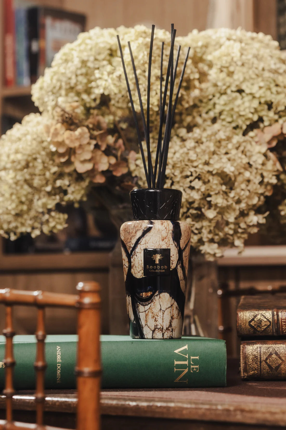 The 500ml Lazuli perfume diffuser draws inspiration from the mesmerizing beauty of the blue stones that give it its name. Its marbled glass with deep blue effects evokes the timeless elegance and strength of Lazuli, while the glossy black cap completes the refined design. With its sophisticated fragrance of musk, cardamom, and sea salt, it offers both a stylish decorative object and an invitation to escape.