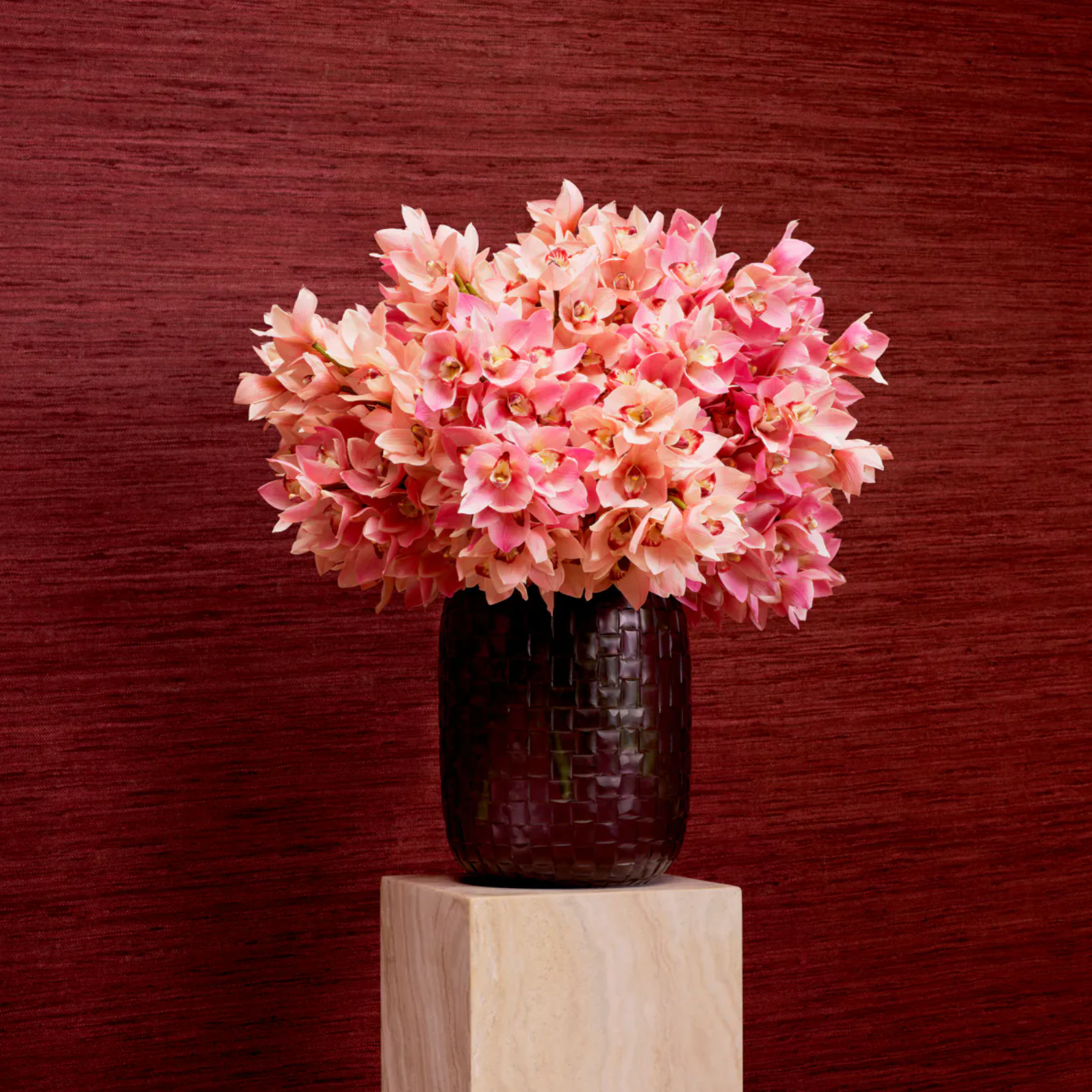 Transform your space with the luxurious charm of this exquisite bouquet of cymbidium orchids in pink tones.