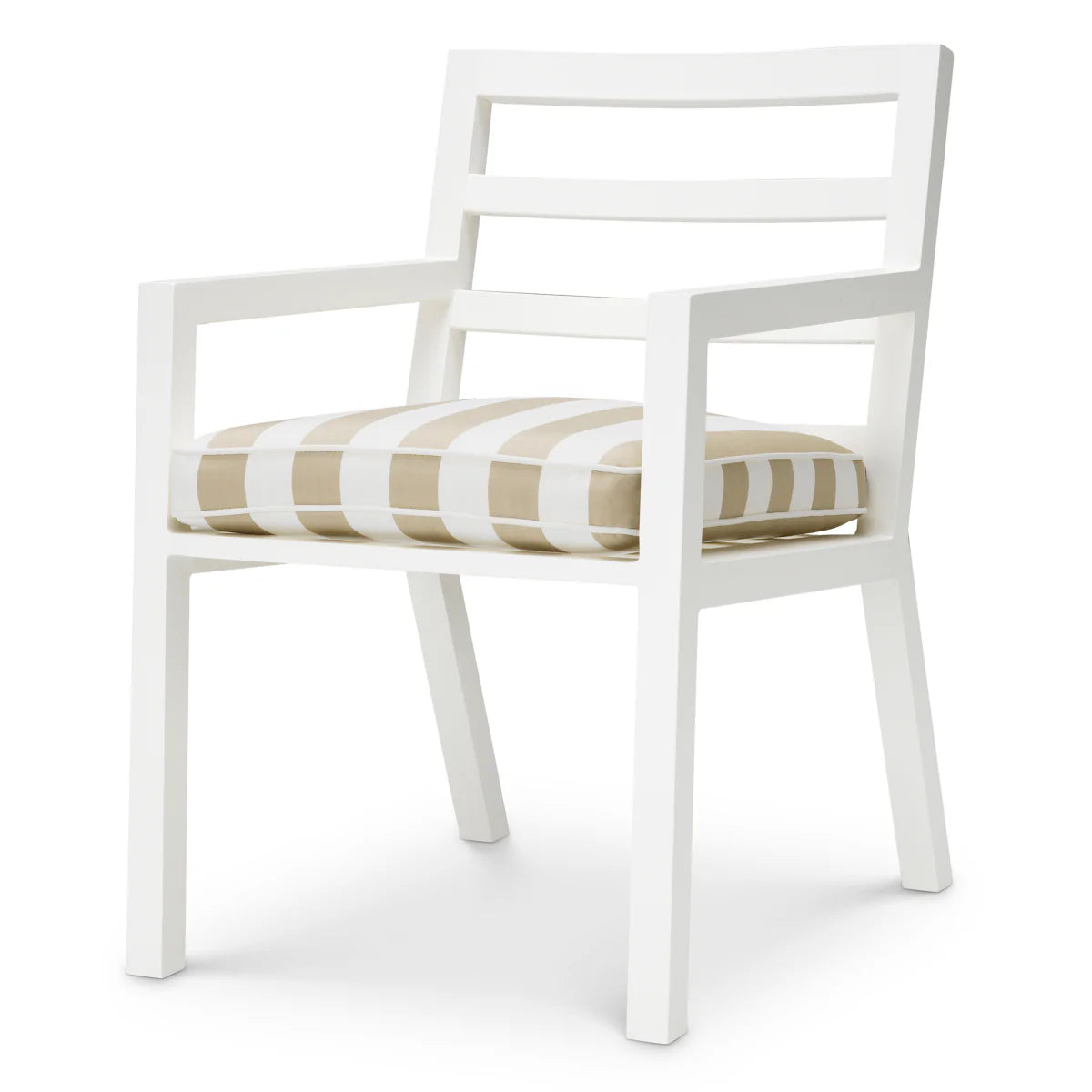 Elevate your outdoor dining experience with the Delta chair, featuring a chic matte white finish and luxurious Florent beige stripe upholstery. Crafted for discerning tastes, this elegant piece combines modern sophistication with timeless appeal, promising unmatched comfort and style. Ideal for those seeking a touch of refined luxury in their alfresco spaces.