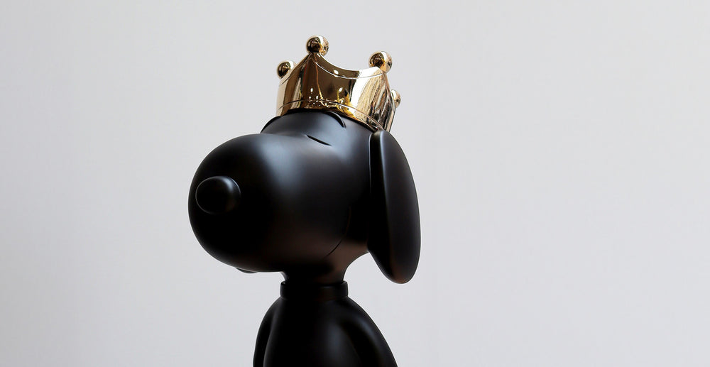 This creation features the famous crowned beagle, celebrating his festive and joyful spirit. The sculpture, available in white and gold, combines sophistication with playful charm, making it a true work of art.