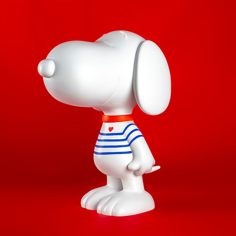 A symbol of French elegance, Snoopy is adorned with white and blue stripes, reminiscent of the iconic sailor suit, while a small collar and a red heart add a vibrant touch to his look.