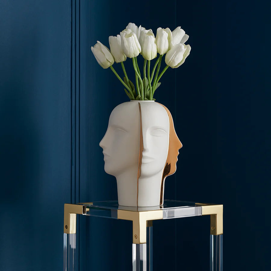 A surreal head-turner, our Atlas Split Vase features four dual looks—each flawlessly halved visage reveals a matte porcelain profile from one angle, and a glittering gold silhouette from the other. With or without flowers, this vessel is the visual treat every chic space needs.
