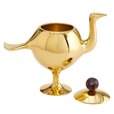 A pared down bird box cast from solid brass and topped with a sphere of real amethyst. Originally a clay model sculpted by Jonathan and his team in our Soho pottery studio. Your heirs will thank you.