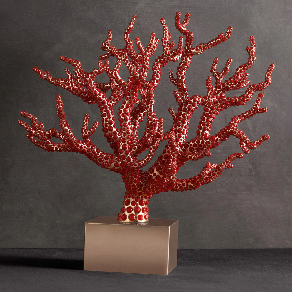 As unique and varied as the brilliant red corals found in the Mediterranean sea, this Coral Centerpiece is a fascinating piece of modern design. Each piece is sculpted by hand by a master artisan, plated in 24K gold and features over 8,000+ hand-set red coral cabochons.