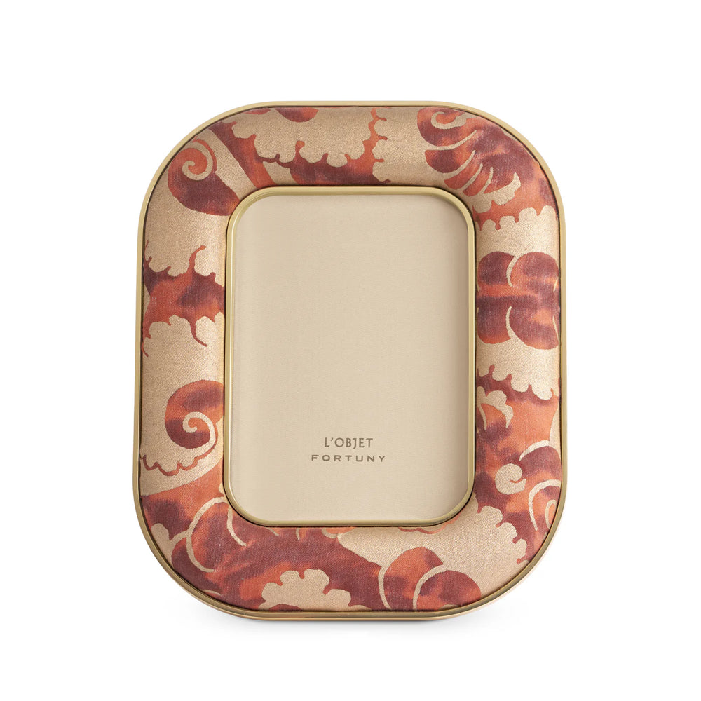 This decorative frame reimagines L’OBJET’s Rue Jacob silhouette in wood and Fortuny fabric. The Laotze pattern in oxblood and gold adds a sense of history and romance to captured memories.