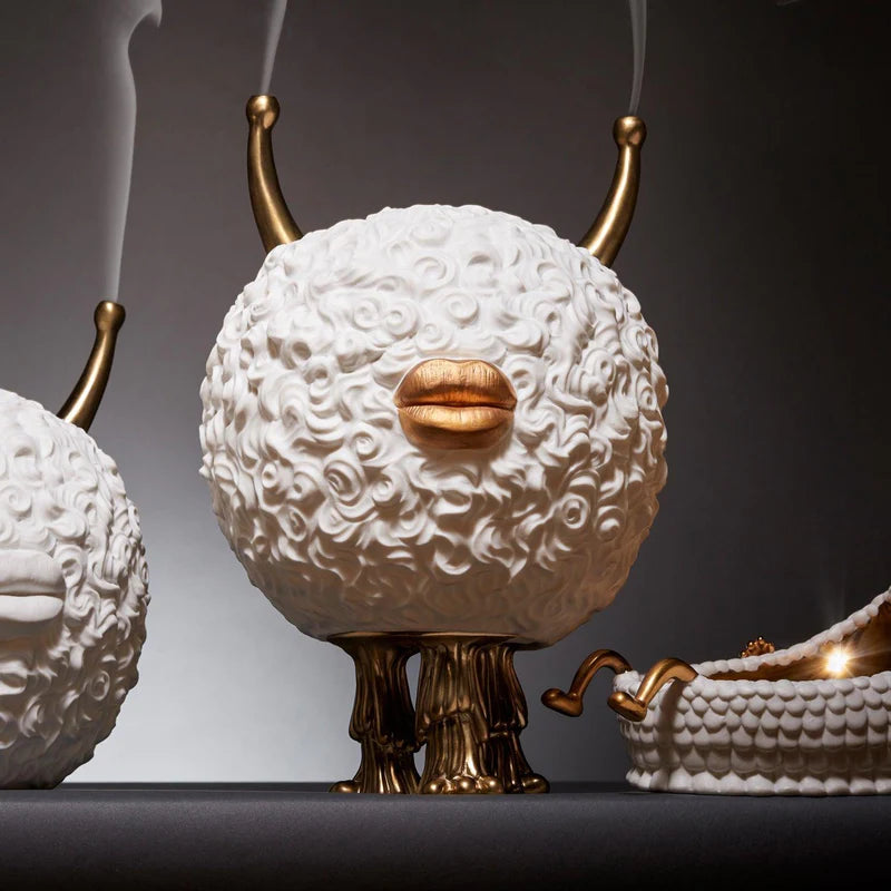 Light incense and conceal under the monster’s porcelain torso, as the incense smolders it’s fragrant smoke will be released through the creature’s brass horns. It's sculpted hair pushes porcelain to its limits creating a texture that is sophisticated and wild.