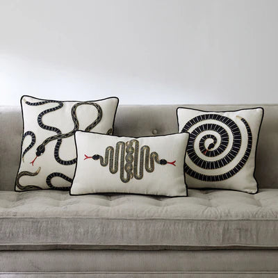 Hand embroidered with a corded edge, our Eden pillow features our signature slithering serpent in classic black and ivory with a bold red tongue. Bring edgy glamour to any pillowscape, or perk up your reading chair with striking style.