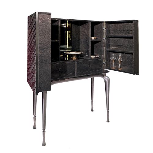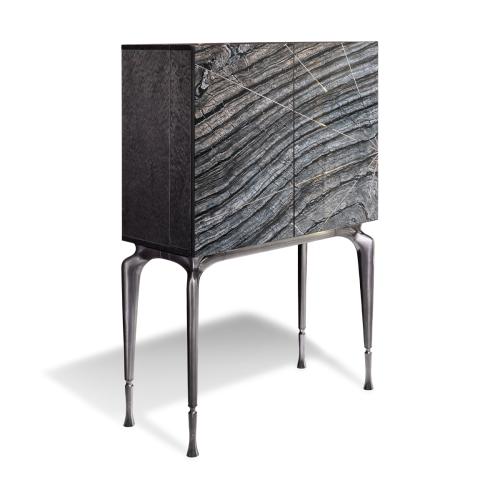 Structure in lacquered or veneered, polished in 100 gloss (both internally and externally). Doors with full-opening system (180°) covered in marble with inlays and frame in polished stainless steel. Internally equipped with 4 shelves, 2 drawers and storage shelves inside the doors. Legs in mirror-polished aluminium cast with tips in satinized aluminium. Wooden parts are available with veneer selection finishings; metal parts can be lacquered in any colour included in the metal finish selection.