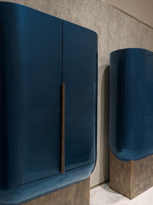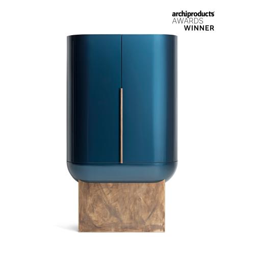 Bar cabinet, plywood and MDF structure. Doors in 100gloss painted wood, with curved sides and a base made up of a hemispherical bottom and a wooden plinth covered in satin steel sheet or hand-buffered bronzed brass. Handles in hand-chromed or bronzed solid brass. Internal shelves covered in soft leather with steel or bronzed brass edge. Metallic finishes are available in the stainless steel version. Optional internal LED lighting. The cabinet is available in RAL/NCS colours or in metallic colours (ICA colours) as an option. Available in the version with mini bar.