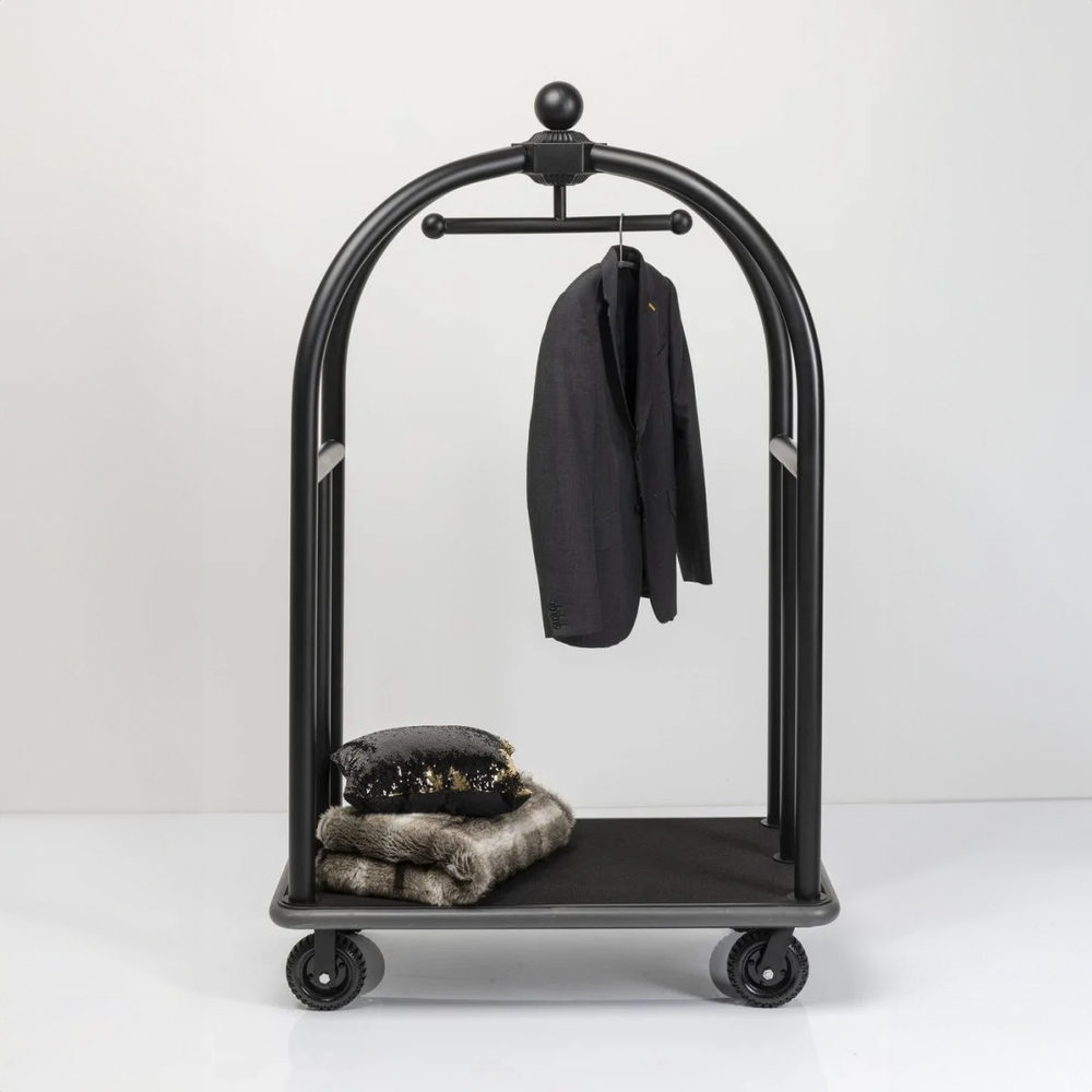 This stylish luggage trolley combines retro chic with glamorous attitude in a successful way. It looks as glamorous in the home as it does in the lobby of a grand hotel. It s also suitable as a wardrobe and a particularly decorative eye-catcher. Four casters provide flexibility and mobility.